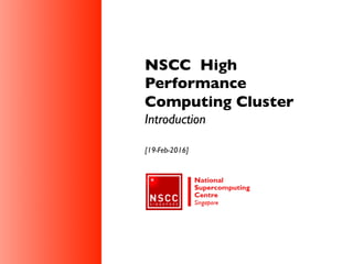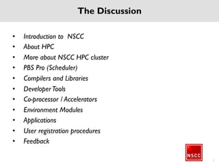 The National Supercomputing Centre (NSCC) provides a high performance computing cluster to support national research and development initiatives, attract industrial research collaborations, and enhance Singapore's research capabilities. The NSCC computing cluster includes over 1,288 nodes with a total of approximately 1 petaflop of processing power, over 13 petabytes of storage, and specialized nodes with GPUs and large memory. Users can access the cluster resources through a scheduler called PBS Pro which manages job queues, scheduling, and resource allocation.