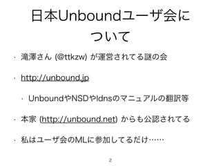 Unboundまとめ • DNSキャッシュサーバとしては十分な機能を持つ。BIND9にない、独