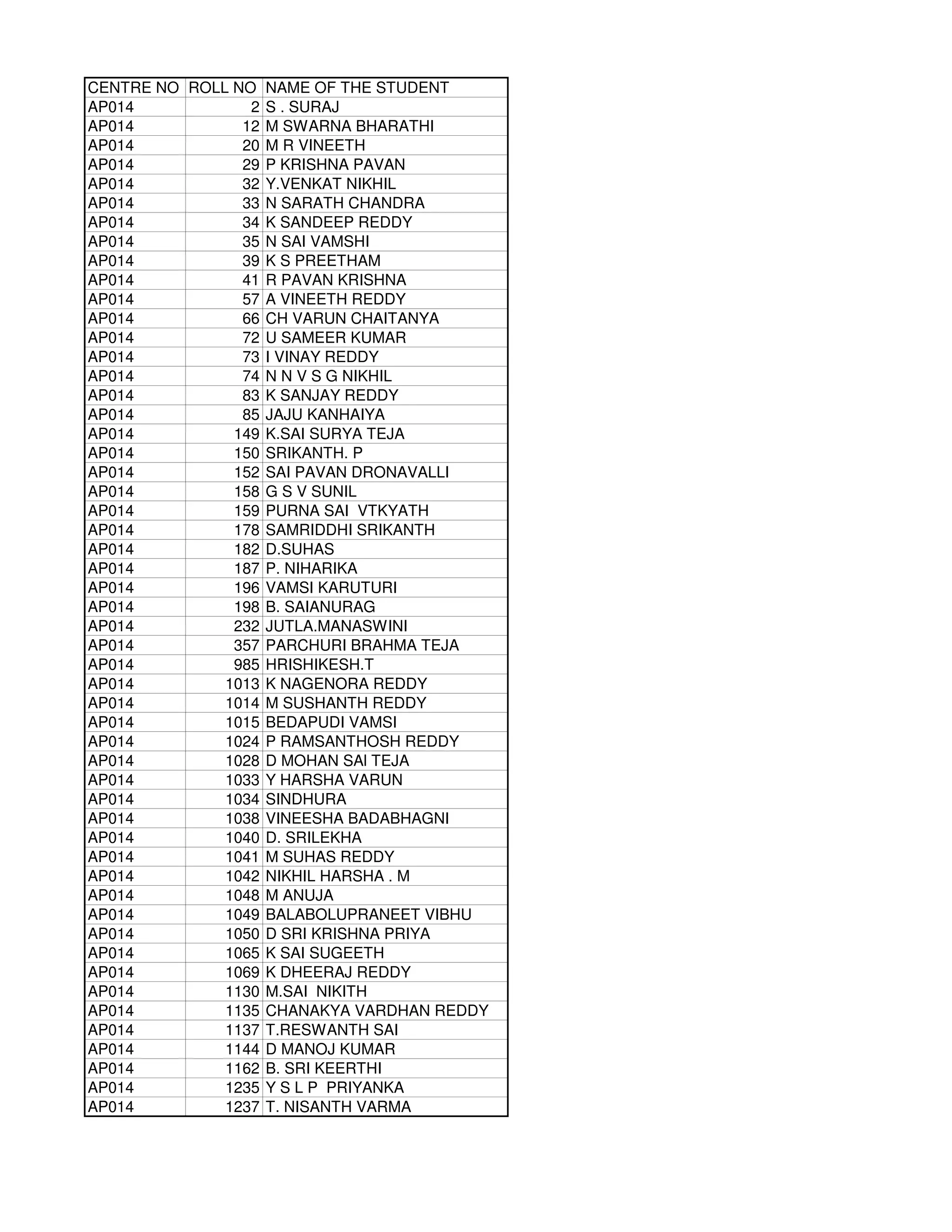 The document contains a list of students with their roll numbers and names. It includes 174 students from centre AP014, along with students from several other centres like AP149, AP173, AP203, AP214, AP218, AP240 and more. The list provides basic details of students in a tabular format with columns for Centre Number, Roll Number and Name of the Student.