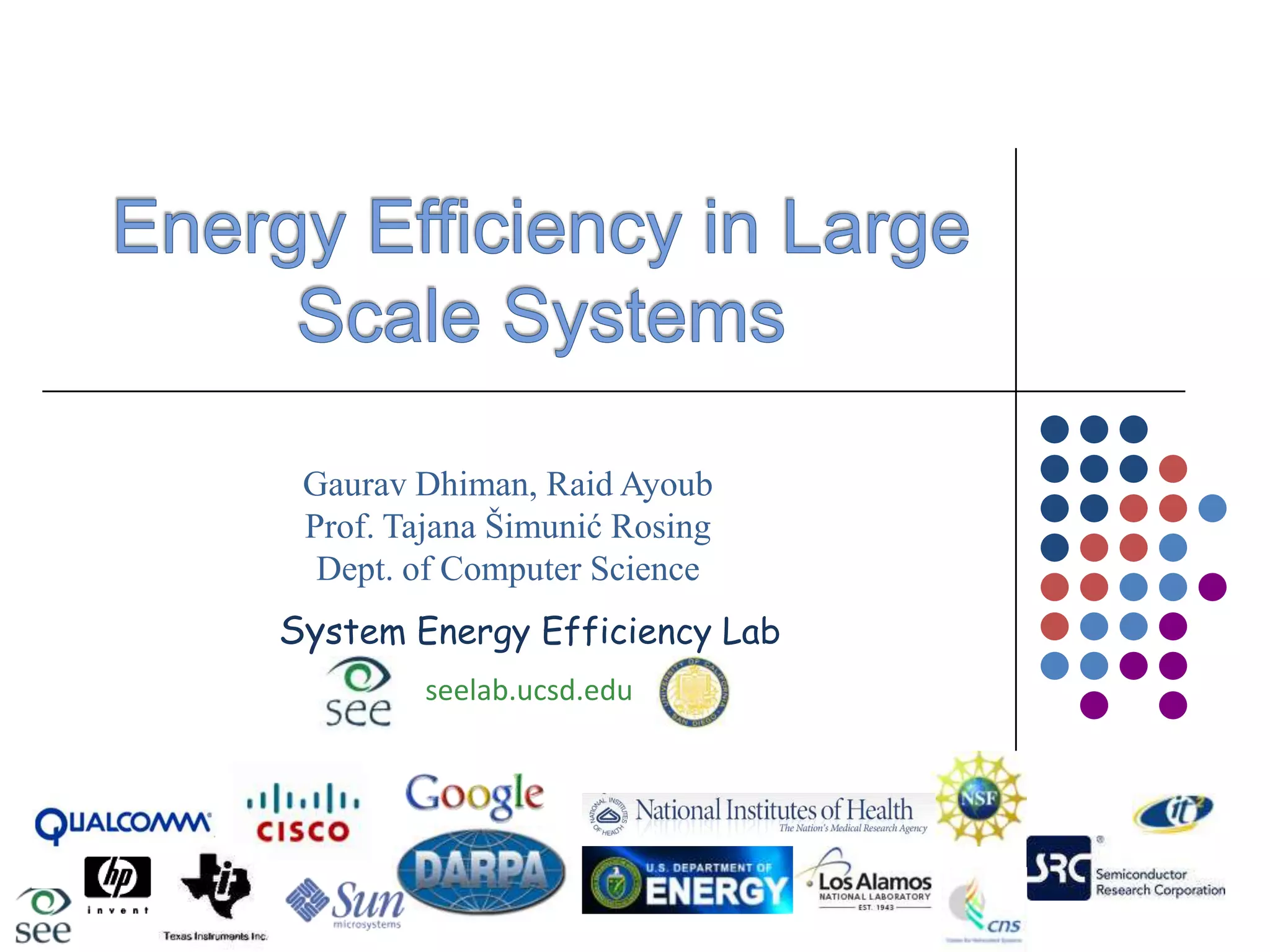 The document discusses energy efficiency in large-scale systems, emphasizing the significance of power consumption and the operational costs associated with data centers. It evaluates how dynamic voltage and frequency scaling (DVFS) affects energy savings and highlights the challenges of achieving energy-proportional computing. The text also explores virtualization benefits for resource utilization and strategies for optimizing cooling systems in server architectures.
