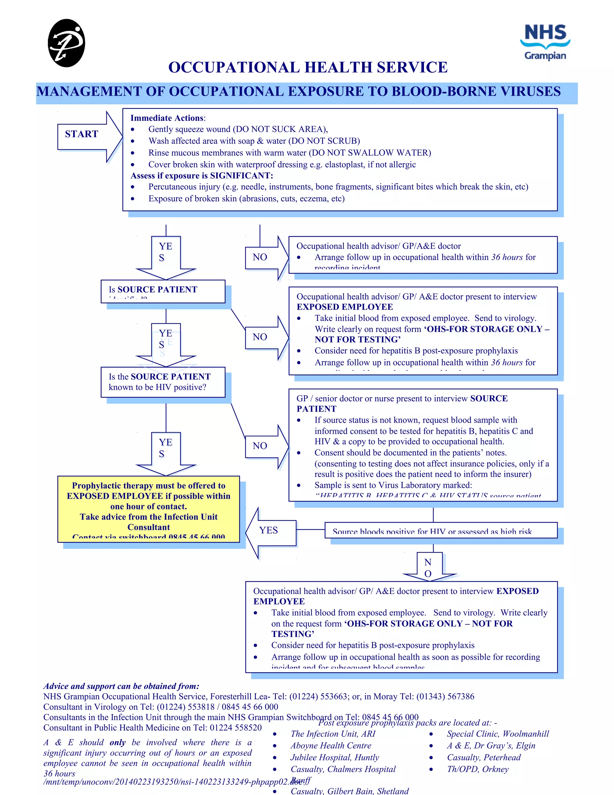 This document provides guidance on immediate actions and assessment for occupational exposure to blood-borne viruses. It outlines steps to take for exposures involving percutaneous injury, broken skin contact, or mucous membrane exposure. It describes arranging follow up care with occupational health or a medical professional within 36 hours to record the incident. For significant exposures, it recommends initial blood samples from the exposed employee and consideration of hepatitis B prophylaxis. If the source patient is identified, consent should be obtained for blood testing and the results provided to occupational health. Prophylactic therapy within one hour of exposure is recommended if the source is known to be HIV positive.