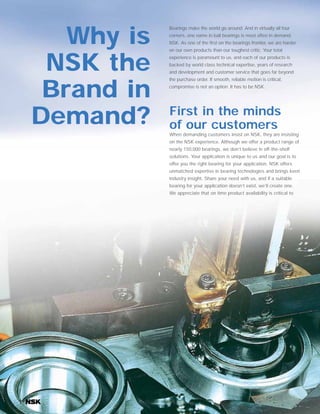 NSK produces deep groove ball bearings that offer outstanding performance in a wide range of applications. NSK prides itself on providing customized bearing solutions and high quality products, ensured by rigorous testing. Key aspects of NSK's bearings include advanced steel, lubrication, sealing technologies, and a focus on meeting unique customer needs.