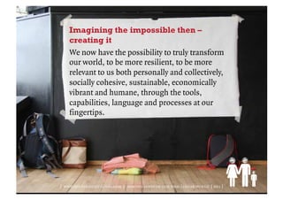 The document discusses the NSL Transformation Lab, which focuses on designing for a resilient and humane future by addressing complex social and economic challenges through a framework of six principles: ambiguity, adaptiveness, openness, participatory cultures, craftsmanship, and seeking epic wins. It emphasizes the importance of transforming organizations and societies by using these principles to navigate and solve 'wicked' problems collaboratively. The lab invites active participants to engage in a transformative experience aimed at developing actionable solutions to pressing issues.