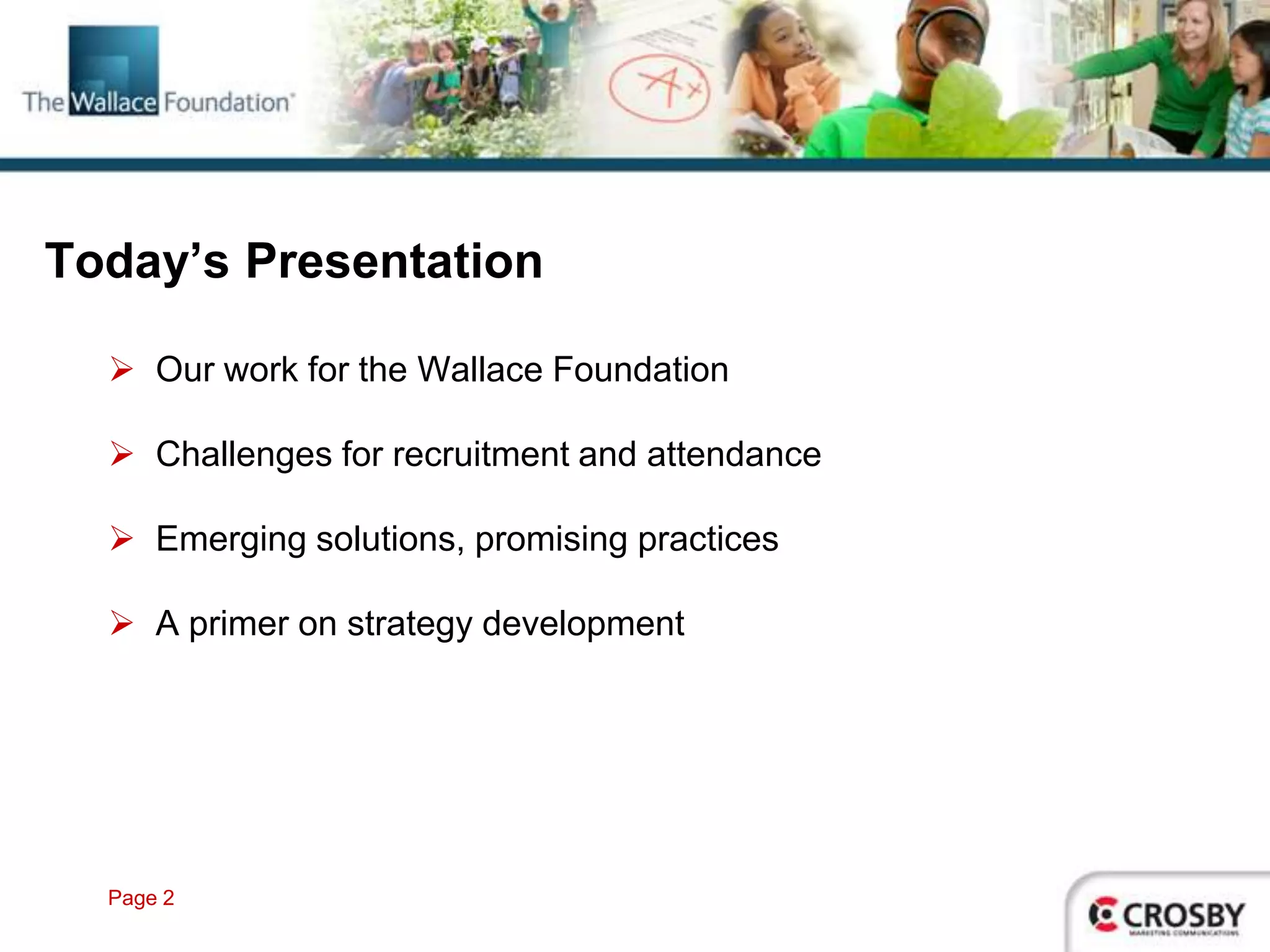 The document outlines a summer learning project conducted by the Wallace Foundation that involved reviewing literature, conducting interviews, and applying social marketing principles to address challenges with recruitment and attendance for summer learning programs. It identifies common challenges such as recruiting being unfamiliar for schools and attitudes of parents and teachers toward summer learning. Emerging solutions discussed include taking a community-based approach through trusted messengers and social norms, developing a comprehensive outreach strategy in four phases, and taking a tactical approach involving high-touch outreach through principals and community partners. The document advocates creating an outreach strategy with clear goals and understanding target audiences before developing tactics and materials.
