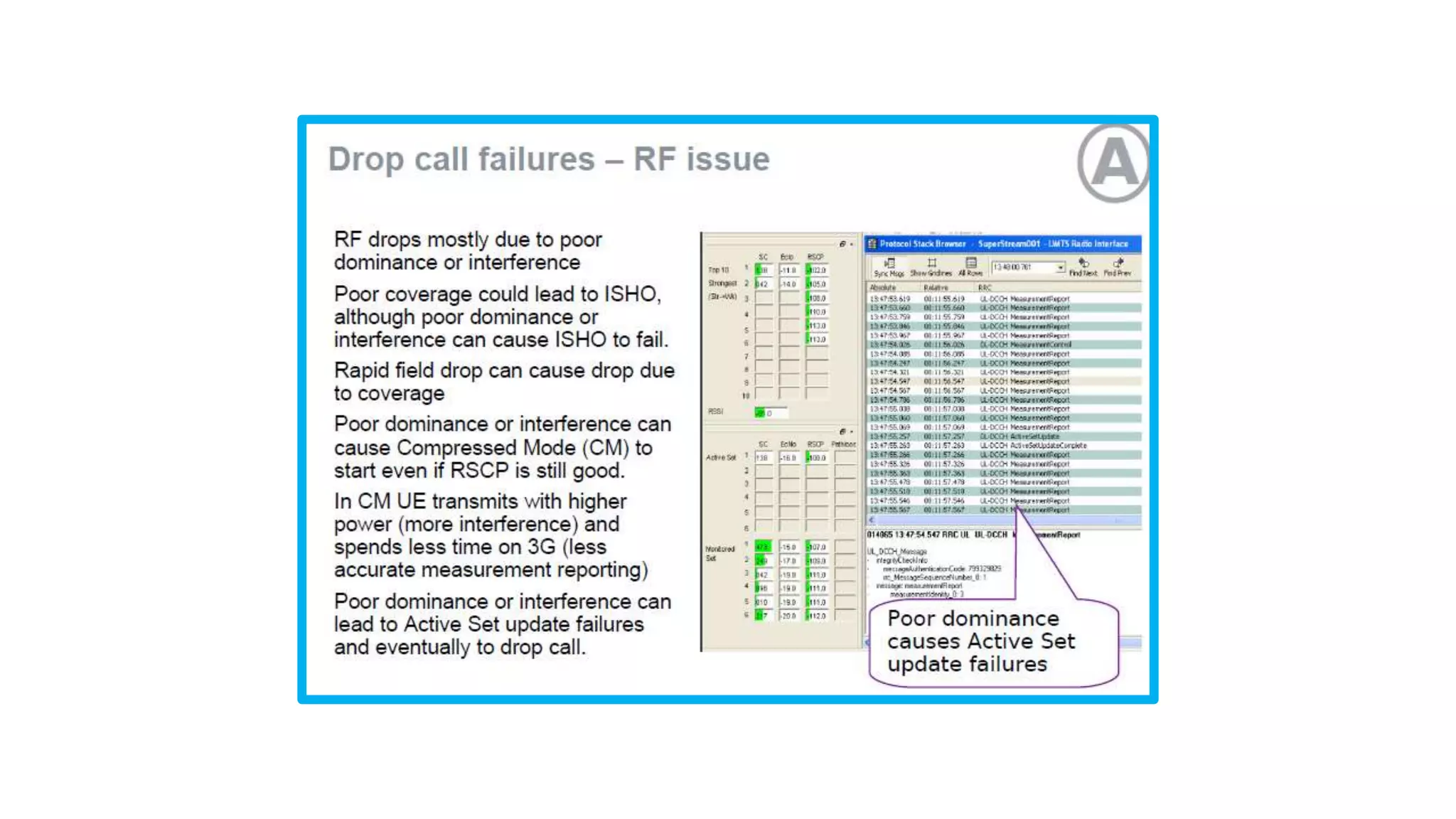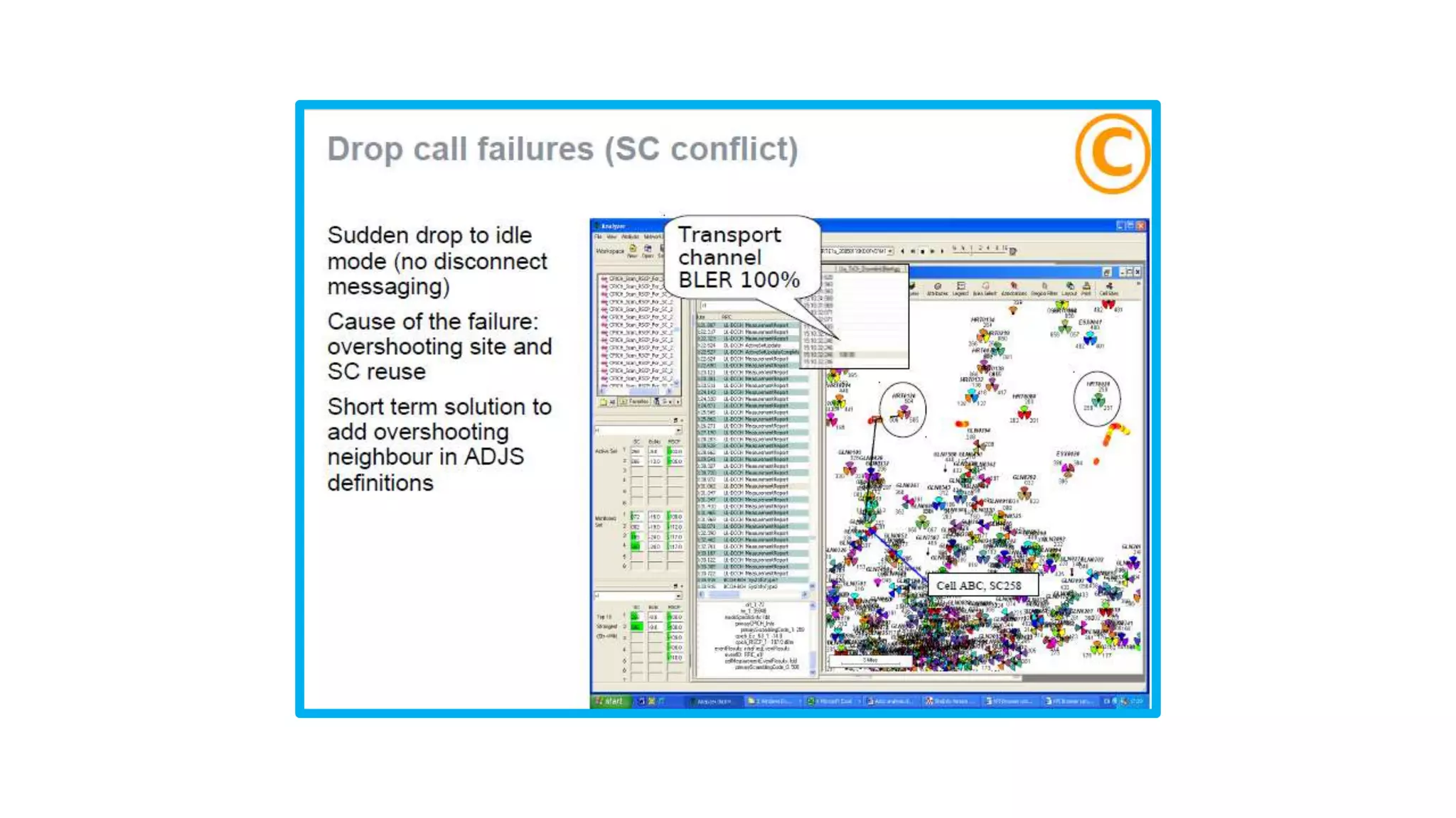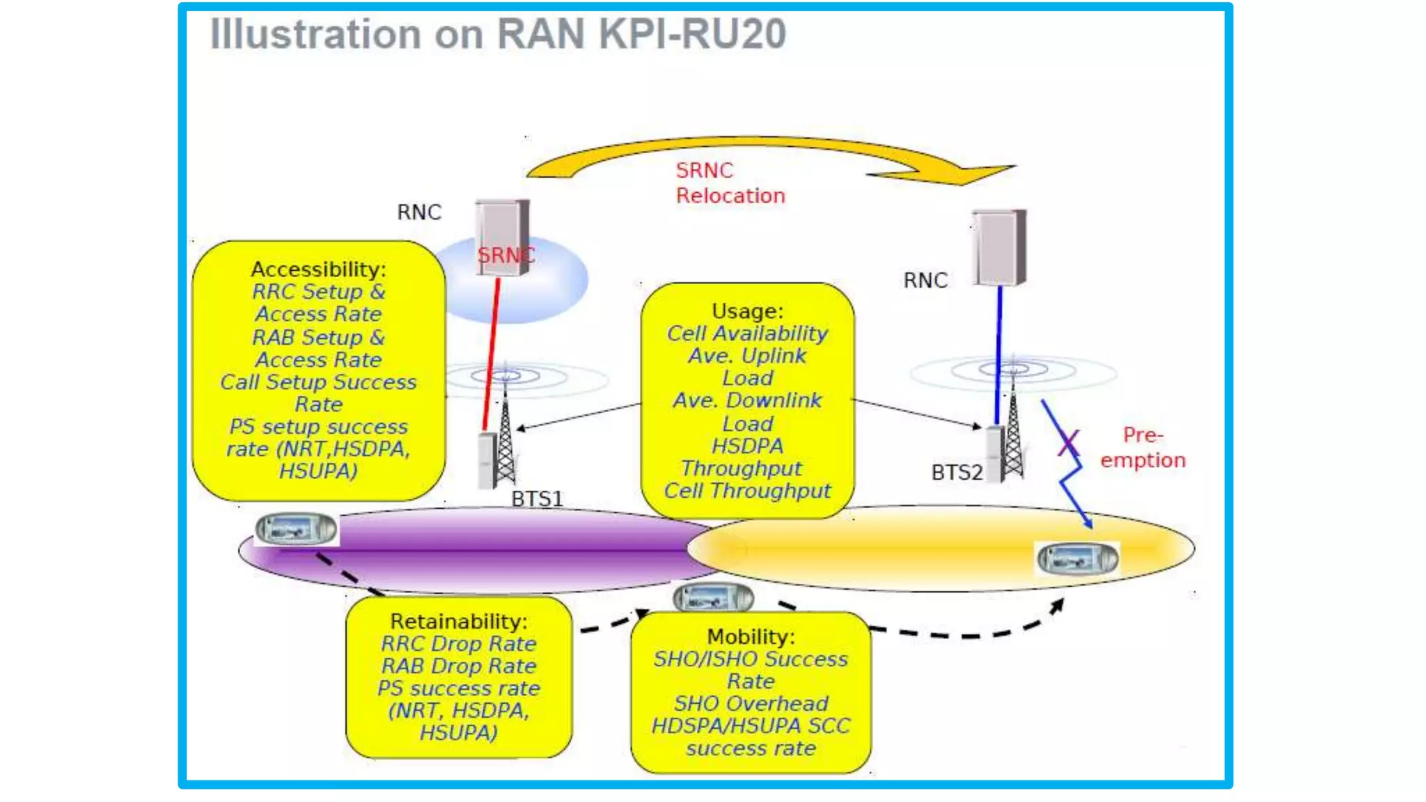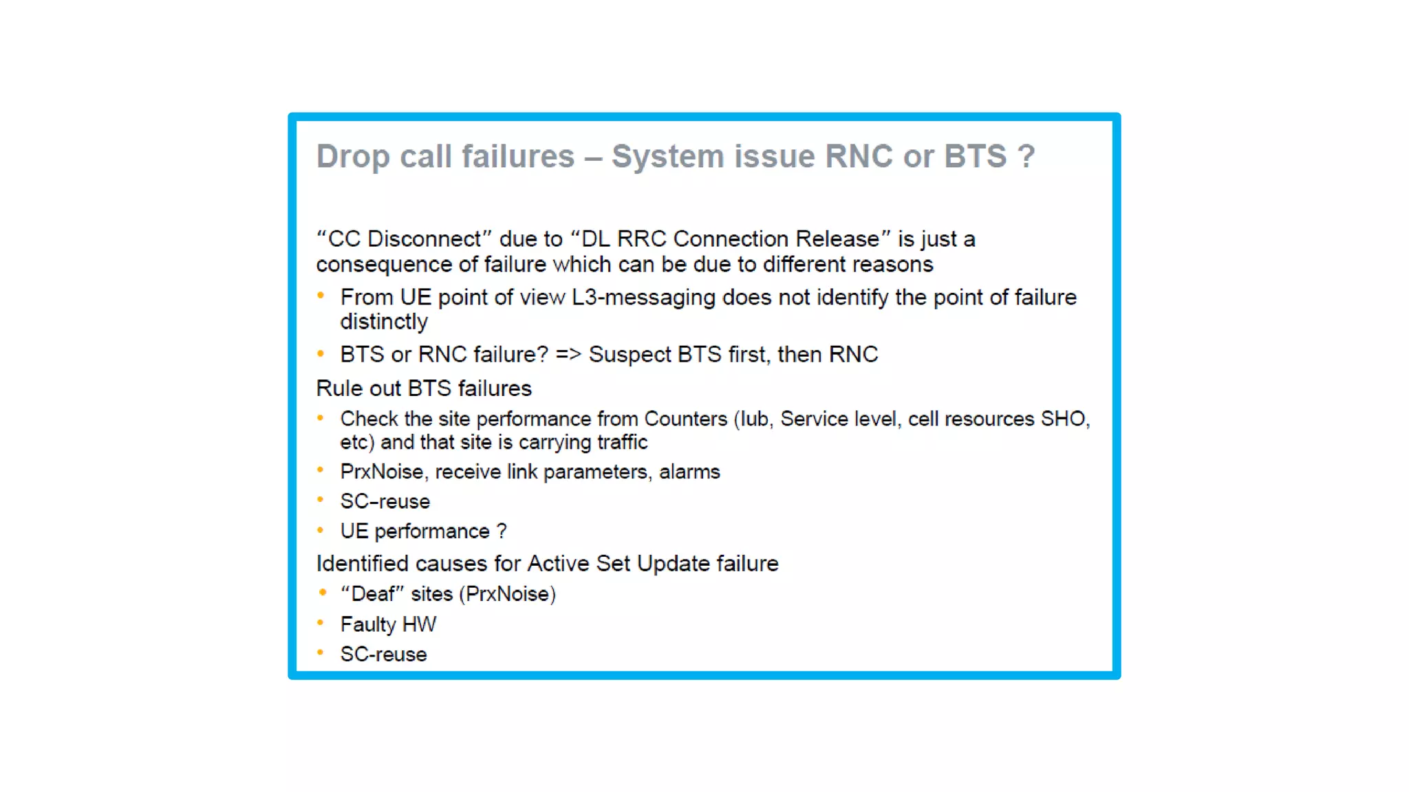 The document discusses key performance indicators (KPIs) related to WCDMA network planning and optimization, focusing on metrics such as call setup success rate, accessibility, and drop call scenarios. It outlines issues that can cause genuine call setup failures and drop calls, including RF issues and system problems in the base transceiver stations (BTS) and radio network controllers (RNC). The analysis aims to improve network performance by identifying and addressing these failures, particularly through missing neighbor analyses.