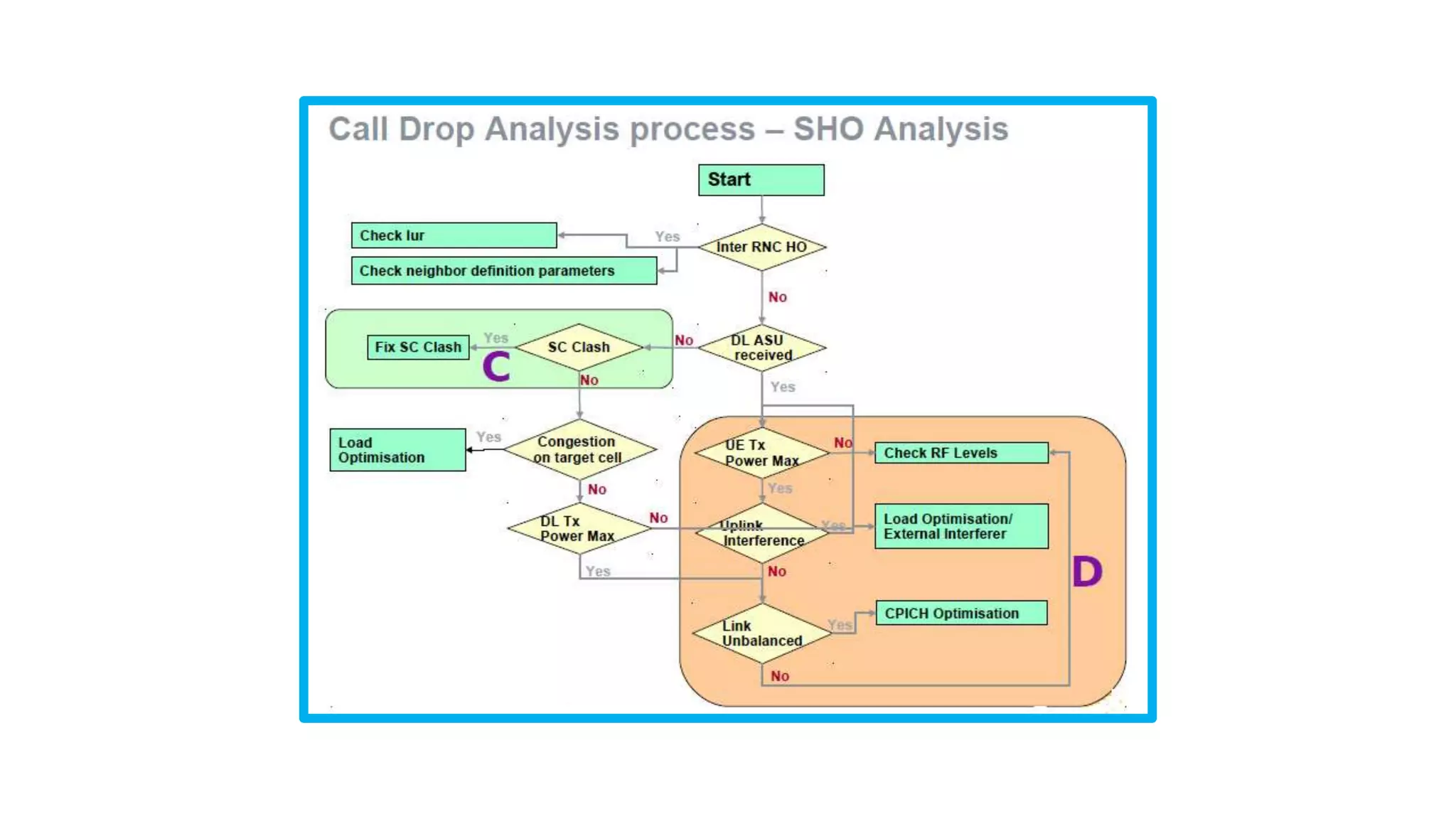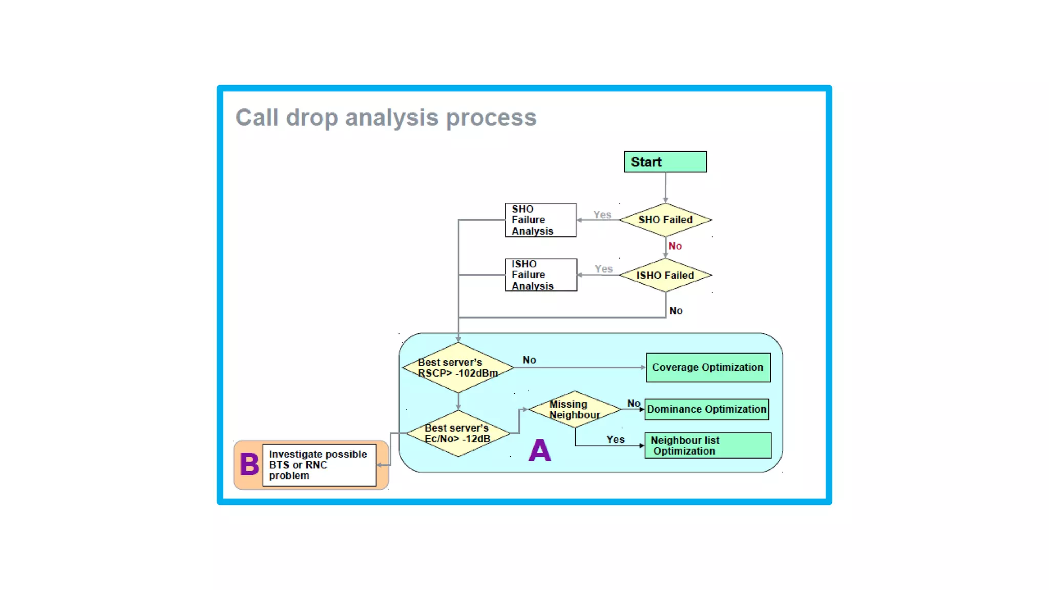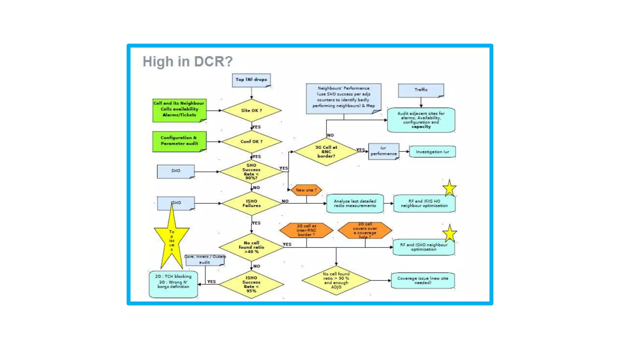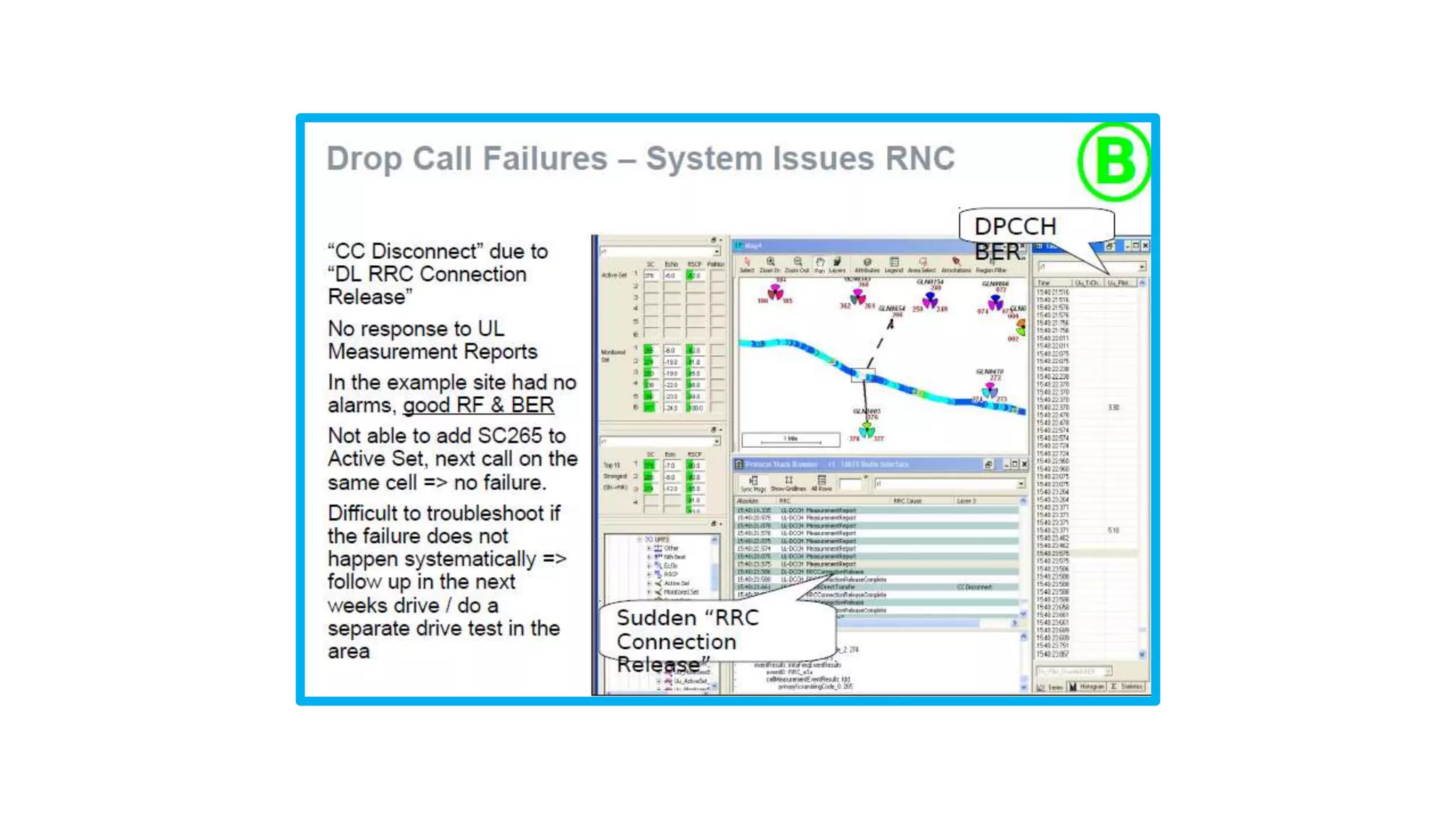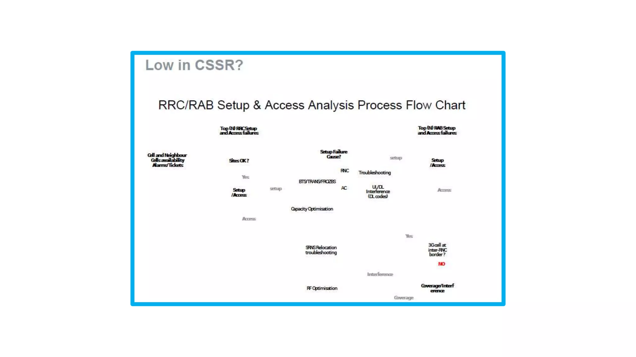 The document discusses key performance indicators (KPIs) related to WCDMA network planning and optimization, focusing on metrics such as call setup success rate, accessibility, and drop call scenarios. It outlines issues that can cause genuine call setup failures and drop calls, including RF issues and system problems in the base transceiver stations (BTS) and radio network controllers (RNC). The analysis aims to improve network performance by identifying and addressing these failures, particularly through missing neighbor analyses.