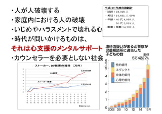 ・人が人破壊する ・家庭内における人の破壊 ・いじめやハラスメントで壊れる心 ・時代が問いかけるものは、 それは心支援のメンタルサポート ・カウンセラーを必要としない社会 2