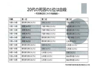 3 平成27年における男女別の年齢階級別の自殺者数の構成割合 総数 19歳以下 20歳代 30歳代 40歳代 50歳代 60歳代 70歳代 80歳以上 不詳 資料:警察庁「自殺統計」より厚生労働省自殺対策推進室作成 69.4 30.6 69.5 30.5 73.6