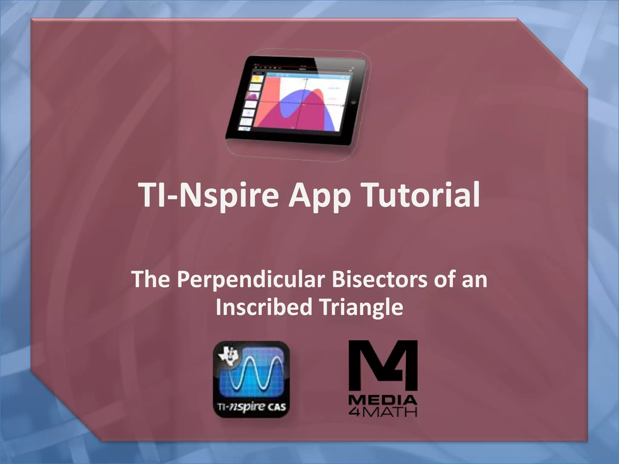 This tutorial demonstrates how to construct the perpendicular bisectors of the sides of an inscribed triangle on a TI-Nspire app. The steps include creating a geometry window, drawing a circle, constructing an inscribed triangle within the circle using three line segments, and using the perpendicular bisector tool to draw the perpendicular bisectors of each side of the triangle, which all intersect at the center of the circle.