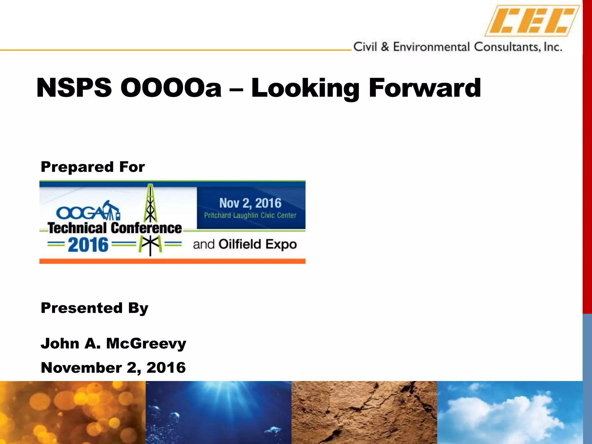The presentation by John A. McGreevy outlines the U.S. EPA's increased understanding of the oil and natural gas industry, highlighting significant regulatory changes and enforcement initiatives. Key topics include compliance timelines for leak detection, the social cost of methane, and the evolving landscape of leak detection technology. The document also discusses future considerations for compliance and the implications of new ozone transport rules on existing sources.