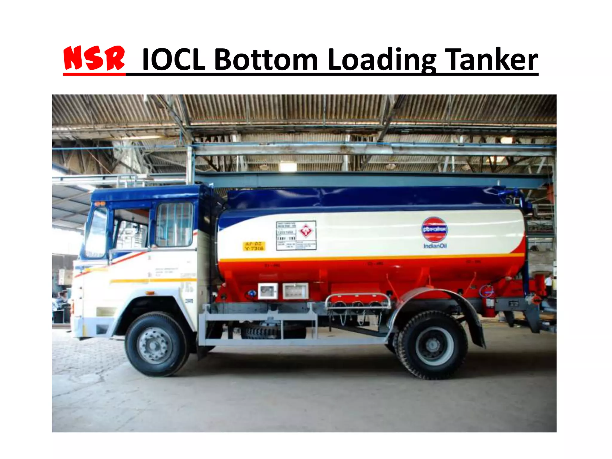 The document provides a detailed overview of the components and features of bottom loading tankers as per IndianOil technical specifications. It highlights various parts such as the vapour recovery system, safety valves, and construction materials used, while also noting compliance with safety regulations from the Petroleum and Explosive Safety Organization (PESO). Furthermore, it includes contact information for N.S. Rama Rao Body Works for inquiries.