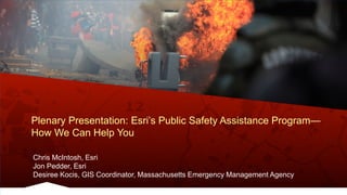 This document summarizes Esri's public safety assistance program and how it has helped agencies respond to disasters. It provides examples of Esri assisting with emergencies and special events in 2014-2015, including floods, blizzards, typhoons, and more. Esri helps agencies plan for incidents by sharing data across organizations, integrating and analyzing data to provide actionable information, deploying easy-to-use applications, and disseminating information to multiple devices.