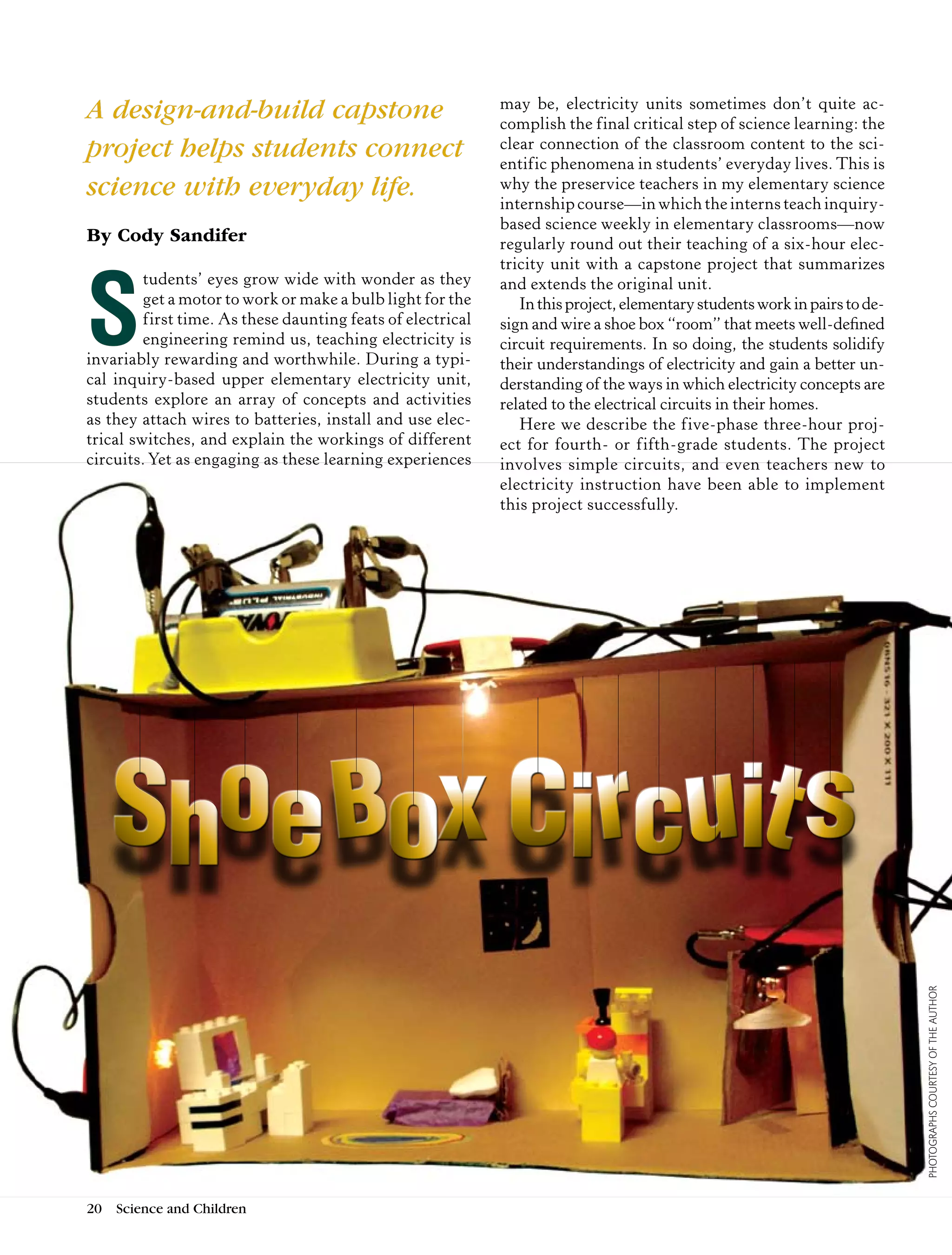 1. The document describes a capstone project for an elementary science electricity unit where students work in pairs to design and build circuits in shoe box models of rooms.