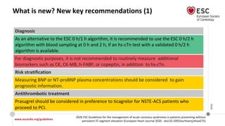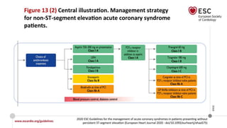 The document summarizes the 2020 ESC Guidelines for the management of acute coronary syndromes in patients presenting without persistent ST-segment elevation. Key recommendations include: