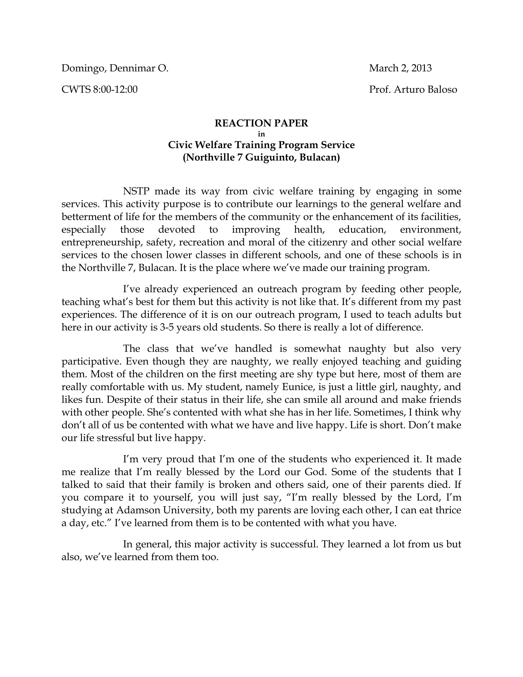 This document is a reaction paper about a civic welfare training program conducted in Northville 7, Bulacan. The author discusses teaching and interacting with 3-5 year old students during the program. Though the students were initially shy or naughty, the author enjoyed guiding them. The author learned that despite challenges in their lives, the students were generally happy and content. Through this experience, the author realized how blessed they are and learned to be content with what they have in life. Overall, the activity was a success as the students learned from the volunteers, and the volunteers learned from the students.