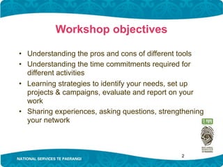 The document provides an agenda for a workshop on using and evaluating cost effective online tools. The workshop objectives are to understand the pros and cons of different tools, time commitments required for various activities, and strategies for planning projects and campaigns and evaluating results. The agenda covers introducing tools for different uses like communication, sharing, and working. It also discusses best practices for managing time, planning social media campaigns, creating policies, and evaluating and reporting on results. Participants will have opportunities to share experiences and examples.