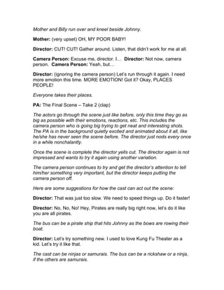 Director: (ignoring the camera person) Let’s run through it again. I need