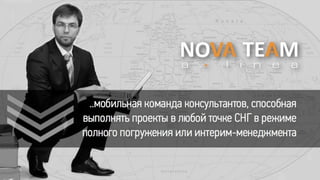 Компания 'Nova Team' представляет собой профессиональную команду, специализирующуюся на решении сложных бизнес-задач и консалтинге, с опытом в управлении системами. Она предлагает услуги длительной реализации проектов с ключевыми позициями в топ-менеджменте, а также разработку семинаров и тренингов для бизнес-команд. Команда акцентирует внимание на повышении профессионализма и получении международных сертификатов, что обеспечивает высокий уровень качества их работы.