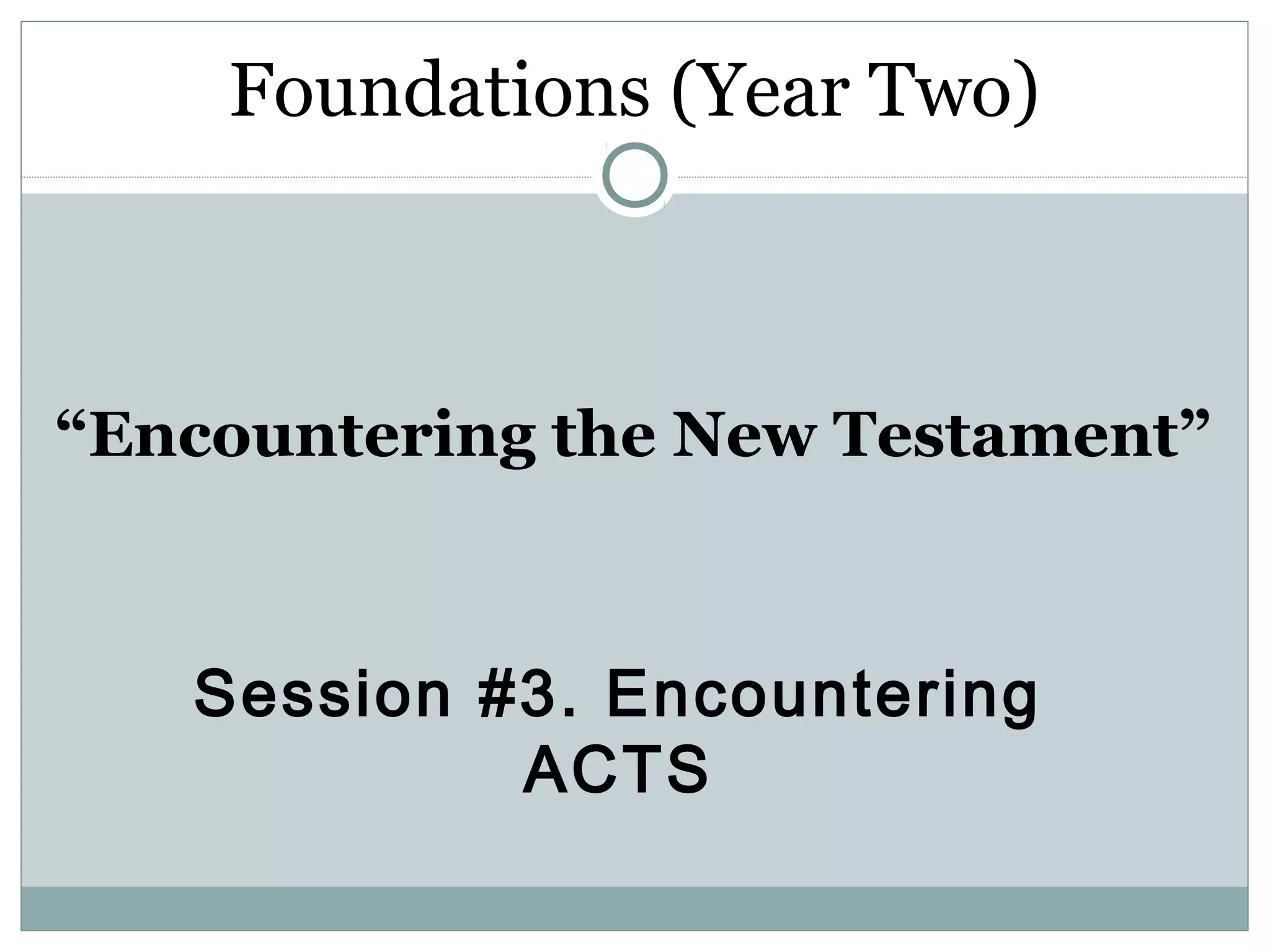 The document provides an overview of the book of Acts from a Foundations course. It discusses key aspects of Acts including its author (Luke), purpose, and outline. It summarizes the main points of several chapters in Acts, including chapters 1, 2, and 3. Chapter 1 discusses Jesus' post-resurrection appearances and the coming of the Holy Spirit. Chapter 2 describes the day of Pentecost and Peter's message. Chapter 3 focuses on a healing miracle performed by Peter and John at the temple.