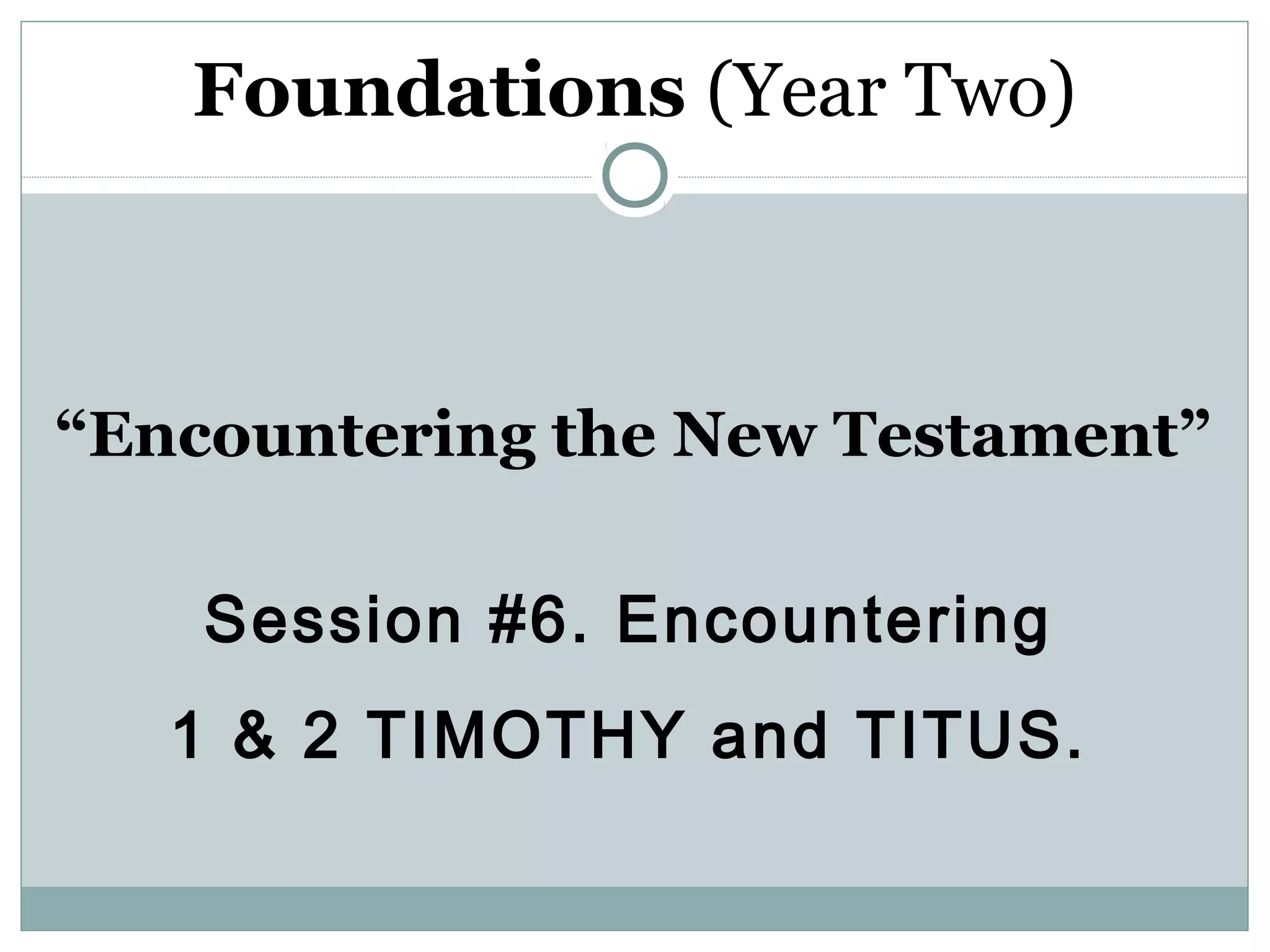The document provides an overview of the Pastoral Letters of 1 Timothy, 2 Timothy, and Titus. It discusses when these letters were likely written based on Paul's travels and ministry outlined in Acts. It also summarizes the key themes and instructions in each letter, such as establishing orderly church structure and leadership to address the threats of false teaching. The document explores the origins and beliefs of early Gnosticism that was starting to influence some churches, which Paul counters in the Pastoral Letters. It outlines the biblical qualifications and roles of church leaders like elders, overseers, and deacons.