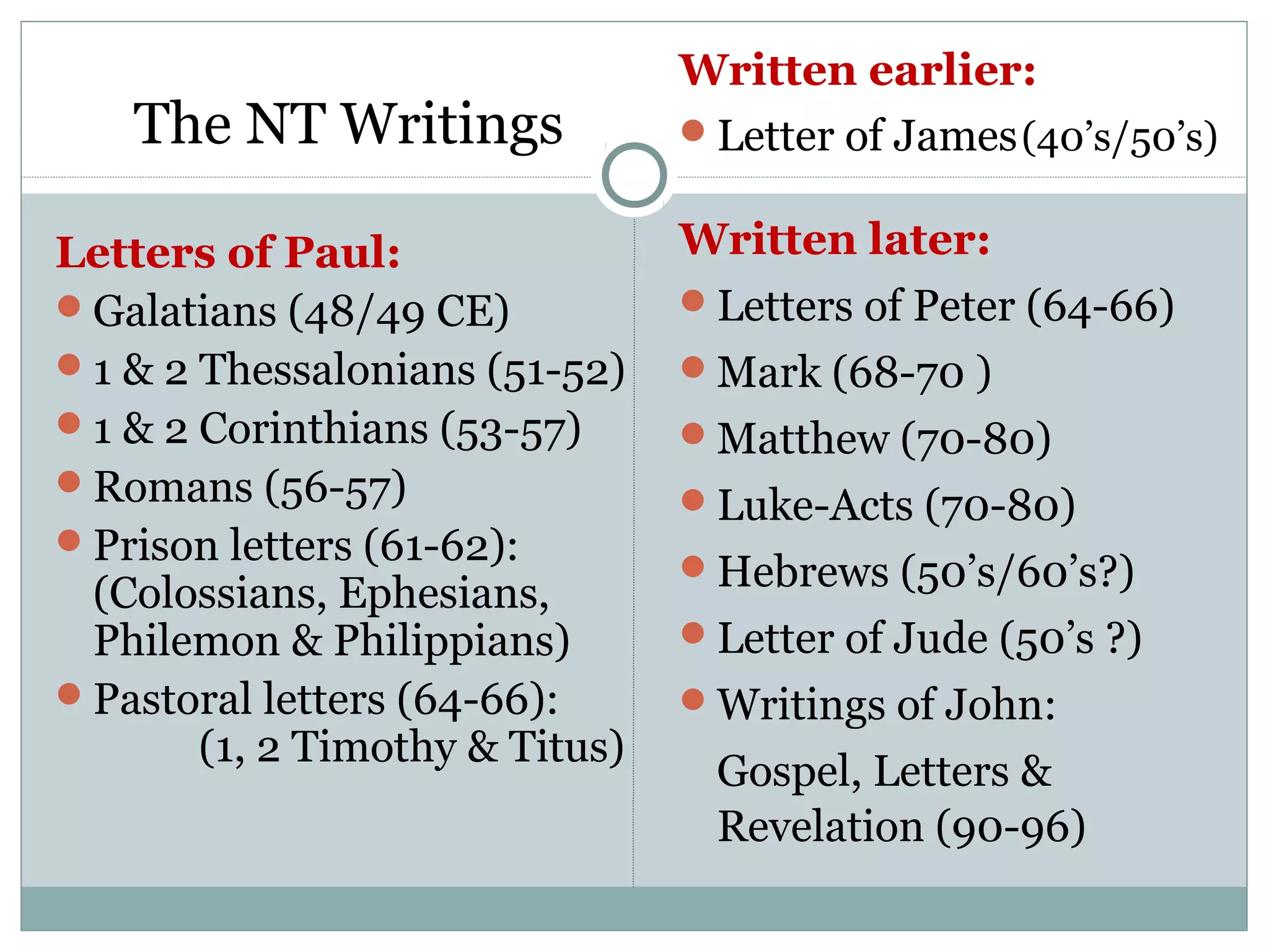 The document provides an overview of the book of Hebrews and the New Testament. It discusses how Hebrews was an enigma due to uncertainties around its authorship, date, and audience. The document then summarizes the key themes and structure of Hebrews, showing how Jesus is superior to prophets like Moses and priests like Aaron. It analyzes some of the interpretive challenges in Hebrews and provides summaries of the five warnings in the book about the danger of falling away from Christianity.