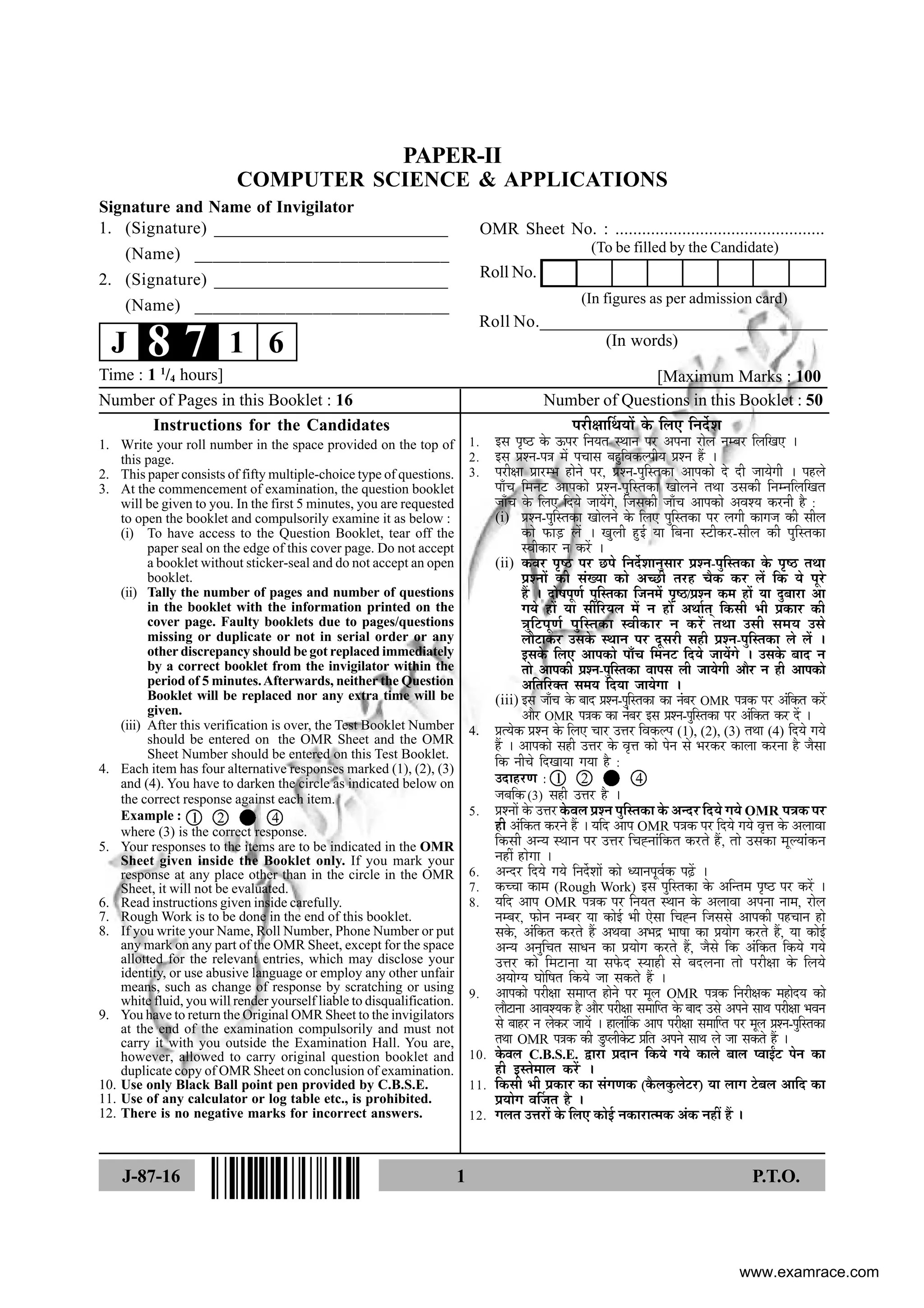 This document provides instructions for a 50 question multiple choice exam on Computer Science and Applications. It states that the exam will be 1 hour and 15 minutes long. It provides detailed instructions on filling out the scantron answer sheet correctly, including bubbling in the test booklet number and other identifying information. It also warns candidates that any attempts to cheat, such as changing answers after or using prohibited materials, will result in disqualification.