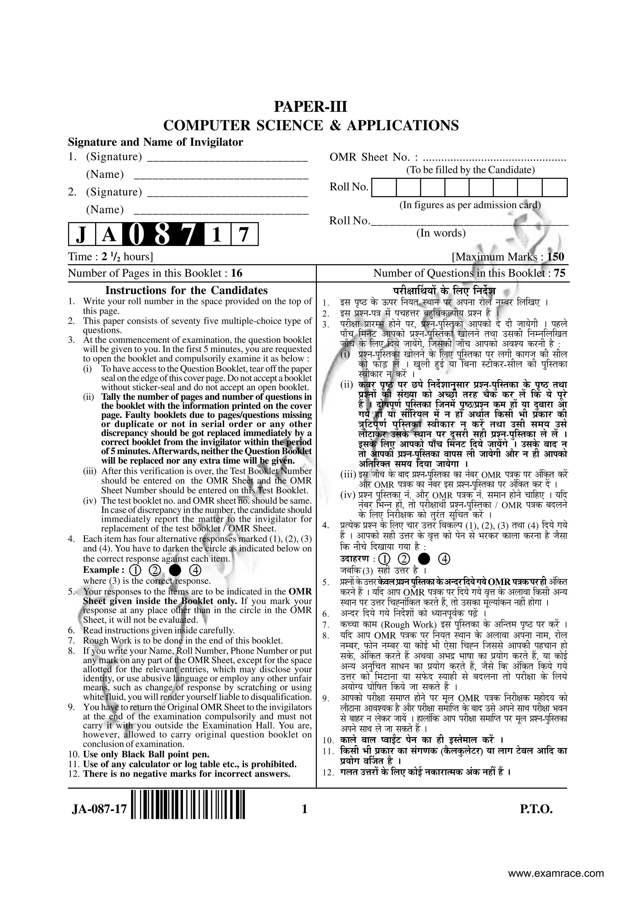 This document provides instructions for a 2.5 hour, 75 question multiple choice exam with a maximum score of 150 marks. It details the number of pages and questions in the exam booklet. It instructs candidates to verify this information and enter identifying codes upon receiving the booklet. Candidates are to mark their answers on the provided OMR sheet by darkening circles corresponding to the question responses. The document outlines exam policies including no use of aids and carrying the booklet but not the answer sheet after the exam. It ends by listing the permitted writing utensil and prohibiting calculators.