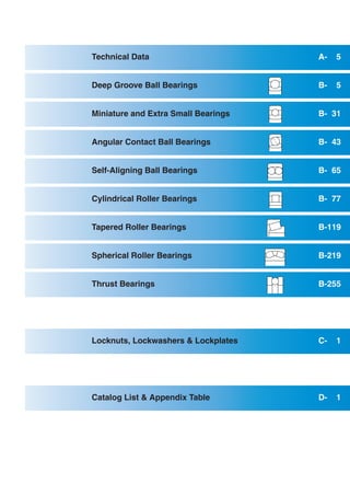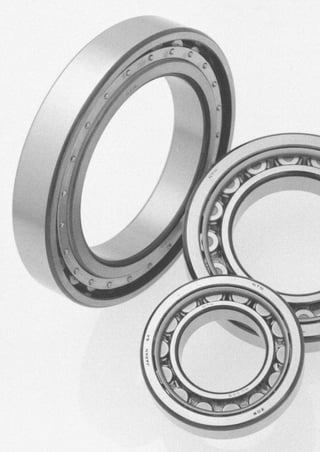 This document provides technical information about ball and roller bearings. It discusses bearing construction, classifications, characteristics, selection criteria, load ratings, life calculations, dimensions, tolerances, fits, clearances, materials, lubrication, sealing, handling, damage and specifications. The document contains detailed information for engineers to properly select, design and apply bearings in machinery.