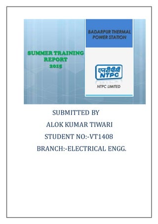 The document is a summer training report by Alok Kumar Tiwari on his experience at the National Thermal Power Corporation (NTPC) from June to July 2015, where he gained knowledge in various departments related to power generation. NTPC is India's largest power generating company, established in 1975, specializing in the engineering, construction, and operation of power plants while also emphasizing environmental sustainability. It aims to expand its capacity significantly by 2017 and engages in initiatives for ecological preservation and socio-economic improvement in affected communities.
