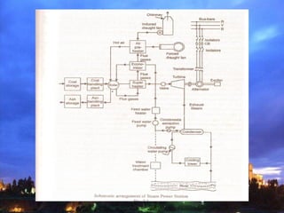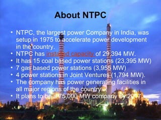 NTPC Dadri is a coal-based thermal power plant located in India with an installed capacity of 29,394 MW generated across multiple power stations. It uses a steam power generation process where coal is burned to produce steam that spins turbines connected to generators, producing electricity. Key components of its steam power generation include boilers, superheaters, economizers, air preheaters, condensers, turbines, cooling towers, and associated electrical equipment. The plant handles over 13,000 tons of coal per day from local mines to fuel power generation and manages coal ash for reuse in construction materials.
