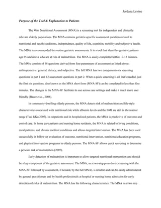 The document discusses the Mini Nutritional Assessment (MNA), a screening tool used to assess nutritional status in elderly populations. The MNA contains 18 questions in two parts - the first part screens for malnutrition risk and the second part fully assesses nutritional status if needed. It identifies individuals at risk of malnutrition and allows for targeted intervention. Studies show the MNA has good reliability and validity in detecting malnutrition across various elderly care settings before other indicators appear. It is widely used internationally but may need adjustment for non-Western cultures. The MNA is considered an effective screening tool for nutritional assessment in older adults.