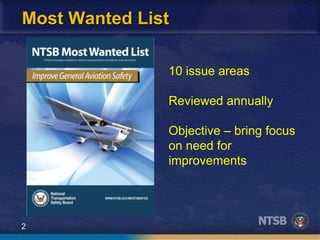 The document discusses the increasing safety concerns related to personal flying, highlighting the NTSB's findings on the rising accident rates over the past decade. It examines data showing that personal flying accidents and fatalities have notably increased, unlike the improvements seen in commercial aviation. The report underscores the importance of pilot decision-making, proficiency, and pre-flight preparation in enhancing safety for general aviation.