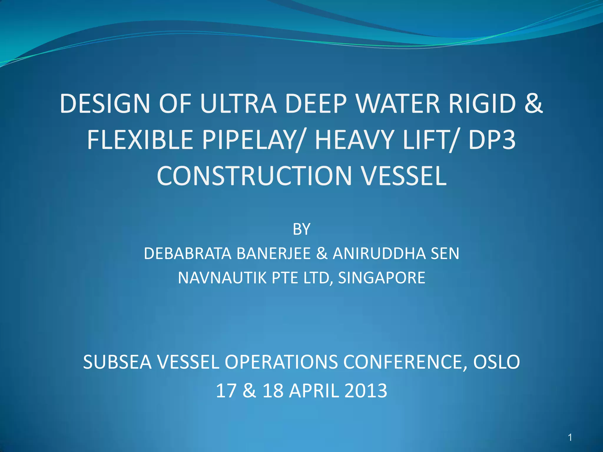 It is 178 meters long with a breadth of 46 meters and draft of 15.6 meters. It can accommodate 239 people and has a deadweight of 11,000 tons. It is equipped with a 3000 ton crane, 1200 ton reels, 1250 ton carousels, and dynamic positioning system. Extensive analyses and testing were performed to optimize the hull design and ensure operational safety in various sea states.