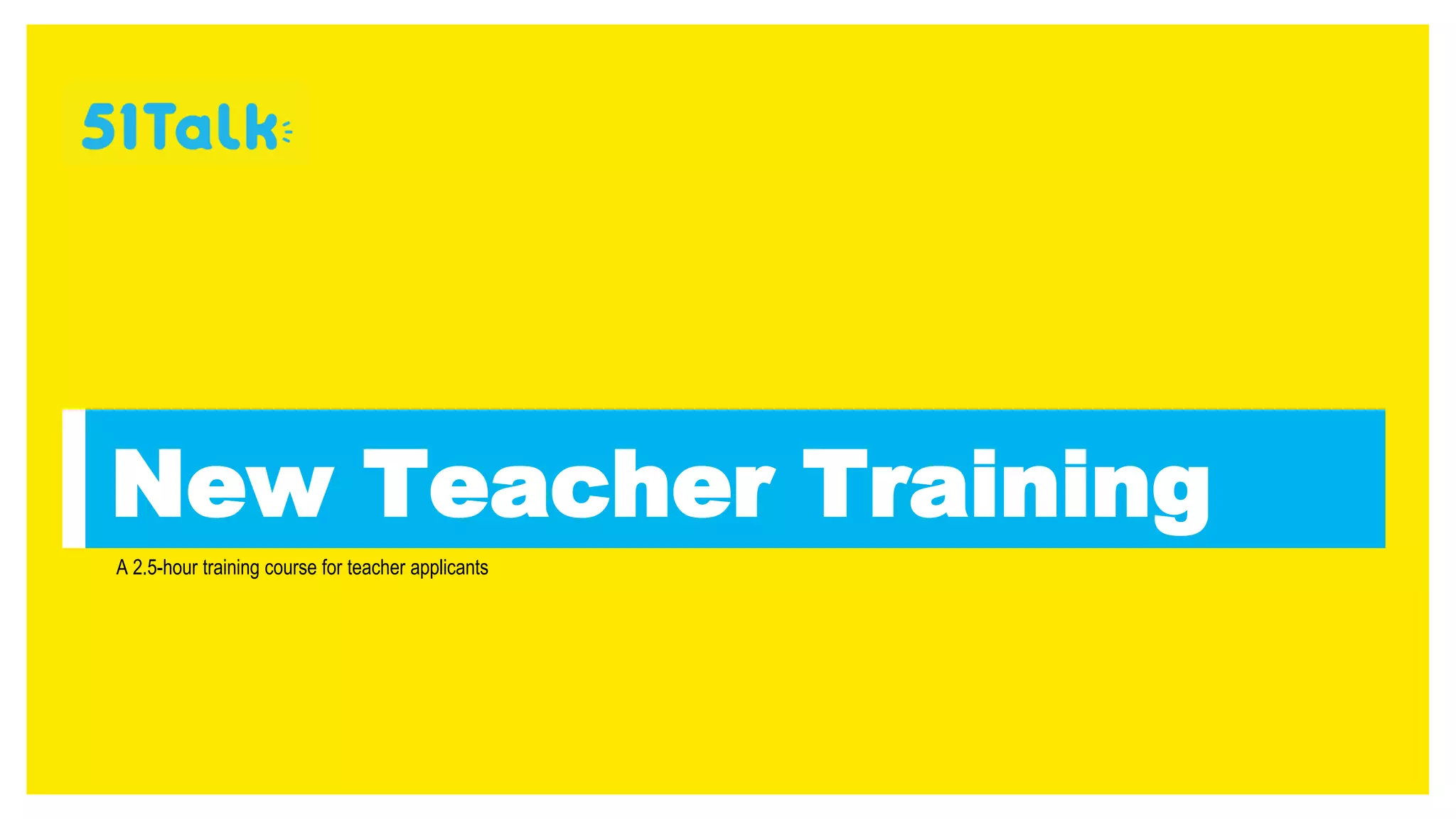 This document outlines the structure and content of a 2.5 hour new teacher training course for 51Talk. It includes sections on house rules, the hiring process, lesson objectives, the 51Talk leveling system for students, and types of lessons. It also discusses how to teach lessons, including the warm-up, presentation, practice, production, and wrap-up stages. Key aspects of an excellent 51Talk lesson are highlighted such as time management, communication skills, and providing corrective feedback. The document provides guidance on dress code and prohibited "taboo" topics of discussion.