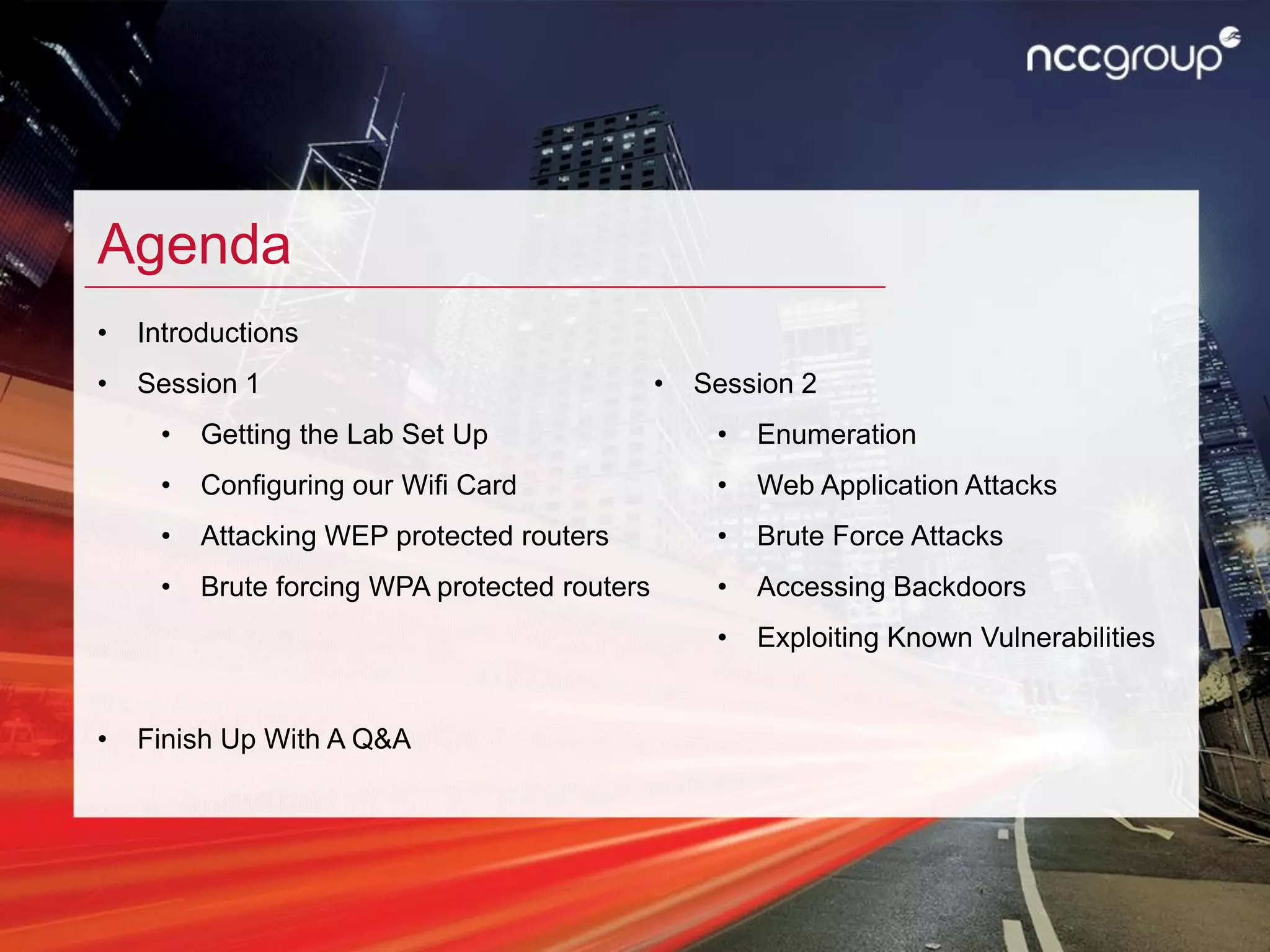 This document provides an agenda and overview for a training session on basic hacking techniques used by real-world attackers. The training will guide participants through setting up a virtual hacking lab and then demonstrate attacks such as cracking WEP and WPA encryption, exploiting vulnerabilities in a vulnerable web application, and using Metasploit to access systems remotely. The goal is to educate managers and executives on common attacks without requiring technical experience.