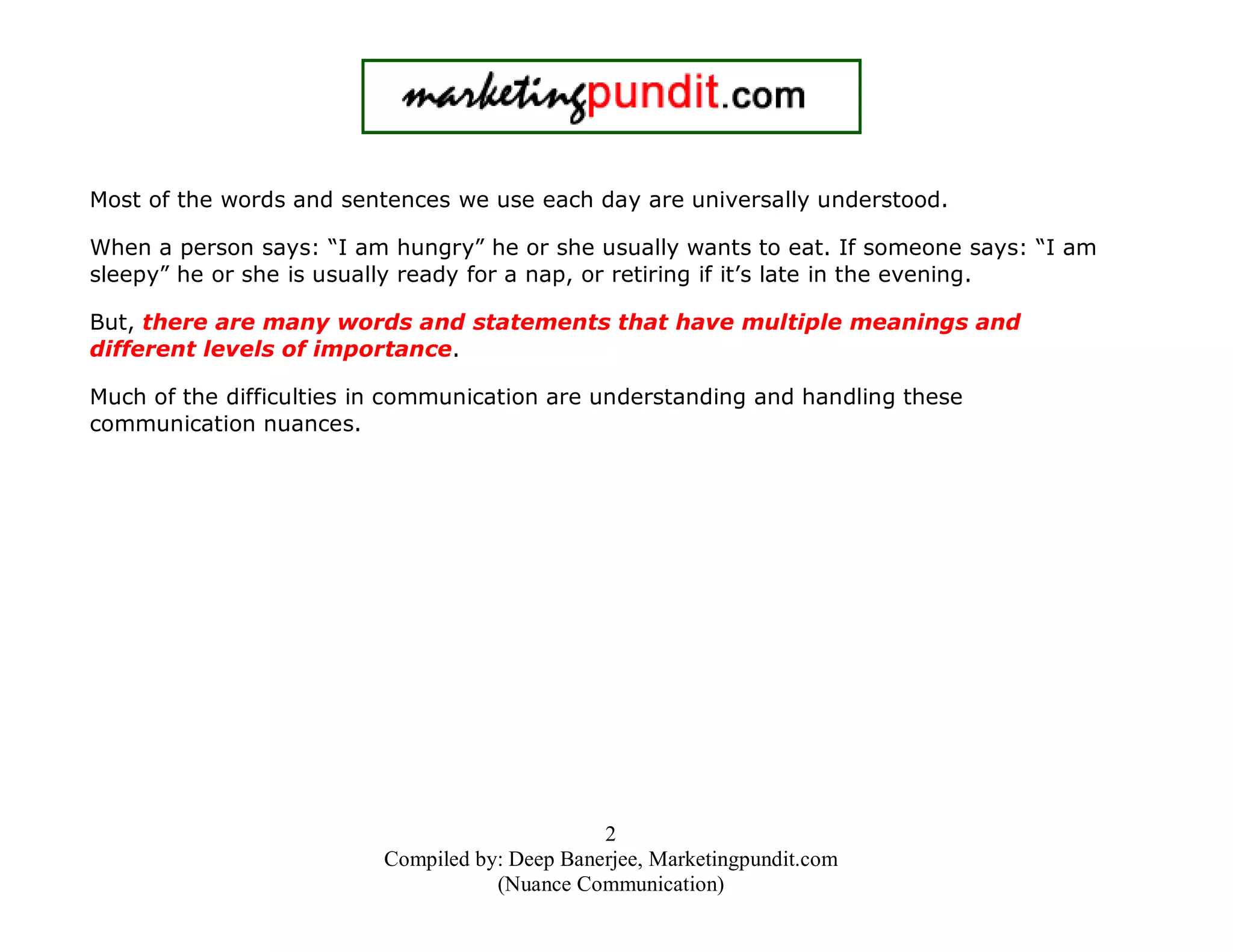 The document discusses the complexities of nuance communication, highlighting that words can have multiple meanings and interpretations, which can lead to misunderstandings. It emphasizes the importance of recognizing these differences, particularly in professional jargon across various fields, to foster better communication. Strategies such as being observant of non-verbal cues and asking clarifying questions are suggested to minimize communication disconnects.