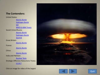 The document summarizes the nuclear arms race between major world powers from 1945 to 2002. It outlines the key events and developments in nuclear weapons testing and capabilities for the US, Soviet Union/Russia, UK, France, China, India, Pakistan, and arms reduction treaties. Major events included the first atomic bomb tests by the US and Soviet Union, development of hydrogen bombs, Sputnik launch, US SDI program, and the 2002 SORT agreement between the US and Russia.