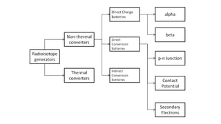 Nuclear batteries generate electricity from the decay of radioactive isotopes without requiring a chain reaction, with technology dating back to 1913. They are primarily used for applications necessitating long-lasting power sources, such as spacecraft and medical devices, and have advantages like high energy density and minimal waste. Despite their promising potential, challenges remain, including high production costs and regulatory issues.