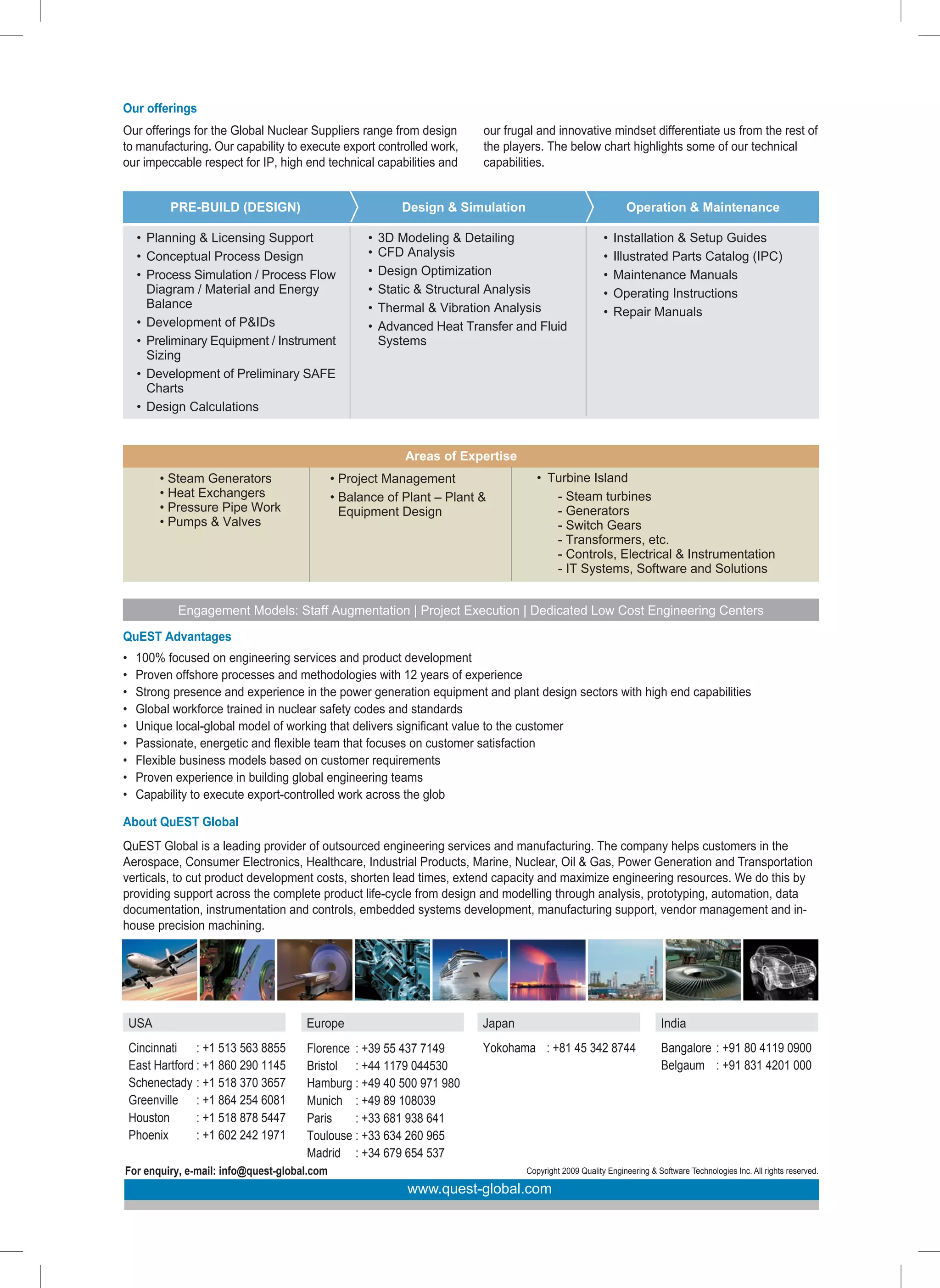 Quest Global is a leading provider of outsourced engineering services and manufacturing, focusing on various sectors including nuclear power. The company supports energy needs by offering comprehensive solutions from design and modeling to prototyping and manufacturing, addressing the growing demand for reliable and sustainable energy. With alliances in the nuclear industry, Quest Global aims to tackle challenges posed by a retiring workforce and a shortage of skilled engineers while delivering high-end technical capabilities.