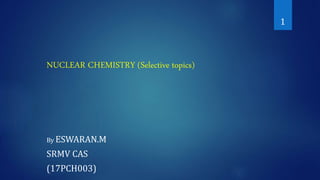 The document covers selective topics in nuclear chemistry, including nuclear isomerism, internal conversion, and the Auger effect. It explains that nuclear isomers are metastable states with relatively long half-lives, and discusses the mechanisms by which nuclei transition to ground states, including the ejection of electrons. The Auger effect is described as the process where the filling of an inner-shell vacancy leads to the emission of an electron from the same atom.