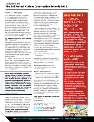 The document announces the 3rd annual Nuclear Construction Summit in 2011. It will bring together over 250 senior executives from stakeholders in the nuclear industry to discuss lessons learned from major construction projects. Attendees will learn about regulatory updates, best practices in project management, and insights from global construction projects to help improve planning and execution on their own nuclear projects. A new financing workshop will provide guidance on ensuring funding for new nuclear power projects. The summit provides intelligence and networking opportunities to facilitate the continued development of the nuclear industry.