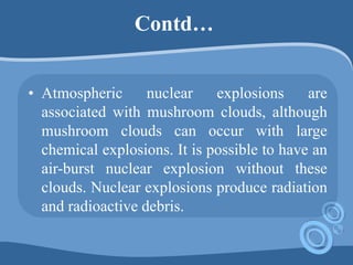 Nuclear explosions are caused by rapid energy release from nuclear reactions, including fission and fusion, and can produce radiation and debris, leading to significant hazards. Nuclear disasters often occur in reactors and result in massive radiation release, with the Chernobyl disaster in 1986 being a notable example that contaminated large areas and caused immediate fatalities. Such events have long-term impacts, including health risks for children and contamination of food supplies.