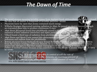 The document provides a history of nuclear energy, from discoveries in the late 19th century to modern use of nuclear power. It describes key events like the discovery of radioactivity and radiation, early experiments identifying nuclear fission, and the first controlled nuclear reaction. It then explains the basic process of how uranium is mined, enriched, and used as fuel in nuclear reactors to generate energy.