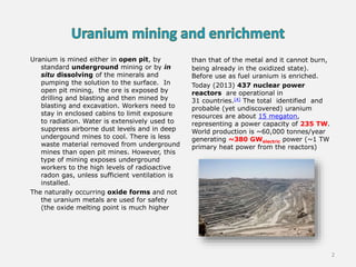 Nuclear energy is generated through fission of uranium or thorium isotopes, which releases heat that is used to generate electricity. It currently provides 13% of the world's electricity, with higher percentages in some countries like France. Uranium is mined through various methods and enriched before being used as fuel in nuclear reactors, where it generates energy through fission. Spent fuel poses environmental and safety risks and challenges with long-term storage, but some methods like fast breeder reactors and thorium reactors could help mitigate these issues. The nuclear power debate involves considerations of both benefits like low-carbon energy production and risks relating to safety, waste disposal, and weapons proliferation.