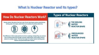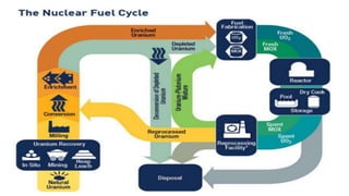 The document discusses a project report on nuclear energy created by a team of 5 engineering students. It includes an introduction to the team members and contents which cover topics like what is nuclear energy, nuclear reactors and power plants, safety standards, types of nuclear fuel and disaster management, and the nuclear fuel cycle and waste management. It then provides summaries on each of these topics written by different team members. Key points covered include how nuclear fission works to generate energy, the components and workings of pressurized water reactors and boiling water reactors, nuclear safety protocols in India, examples of past nuclear accidents, and the nuclear fuel cycle from mining to waste disposal and storage.