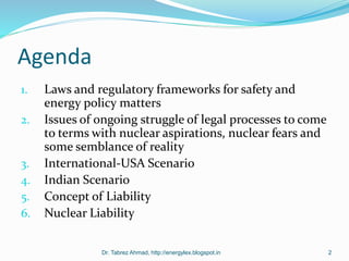 This document discusses various topics related to nuclear energy law and policy. It begins by outlining the agenda and then discusses the primary legal structures governing nuclear regulation in the US, including the Atomic Energy Act of 1954 and the Nuclear Regulatory Commission. It also discusses the international regulatory framework and functions of the NRC. Key issues addressed include nuclear licensing processes, resource selection, nonproliferation concerns, the proposed Yucca Mountain waste repository, and the quality of nuclear regulation. The document also provides an overview of India's energy sector and the country's nuclear scenario.
