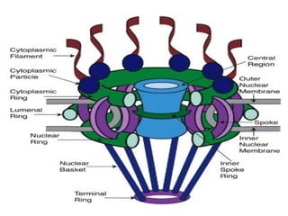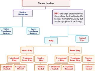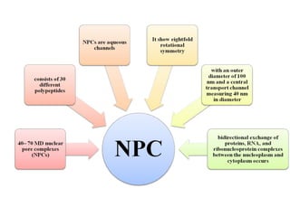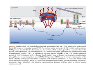 The nuclear envelope consists of two parallel membranes separated by 10-50 nm. It serves as a barrier between the nucleus and cytoplasm. Nuclear pores are circular complexes of proteins that form openings in the nuclear envelope, allowing transport of molecules between the nucleus and cytoplasm. The nuclear envelope forms through the recruitment of membrane vesicles to chromatin, fusion of these vesicles, and assembly of nuclear pore complexes. Key proteins like POM121 and NDC1 are essential for nuclear pore complex assembly after the formation of the double nuclear membrane.