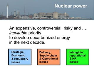 Developing a new nuclear site in the UK faces challenges in three main areas: strategic and economic regulatory issues, supply chain and operational delivery issues, and intangible reputational and human resource issues. Key challenges include high costs, gaining public acceptance, managing the project lifecycle, developing the nuclear supply chain and workforce skills, and navigating the regulatory process. Nuclear power presents an option for reducing carbon emissions but developing new sites will require overcoming substantial political, economic, and social hurdles.