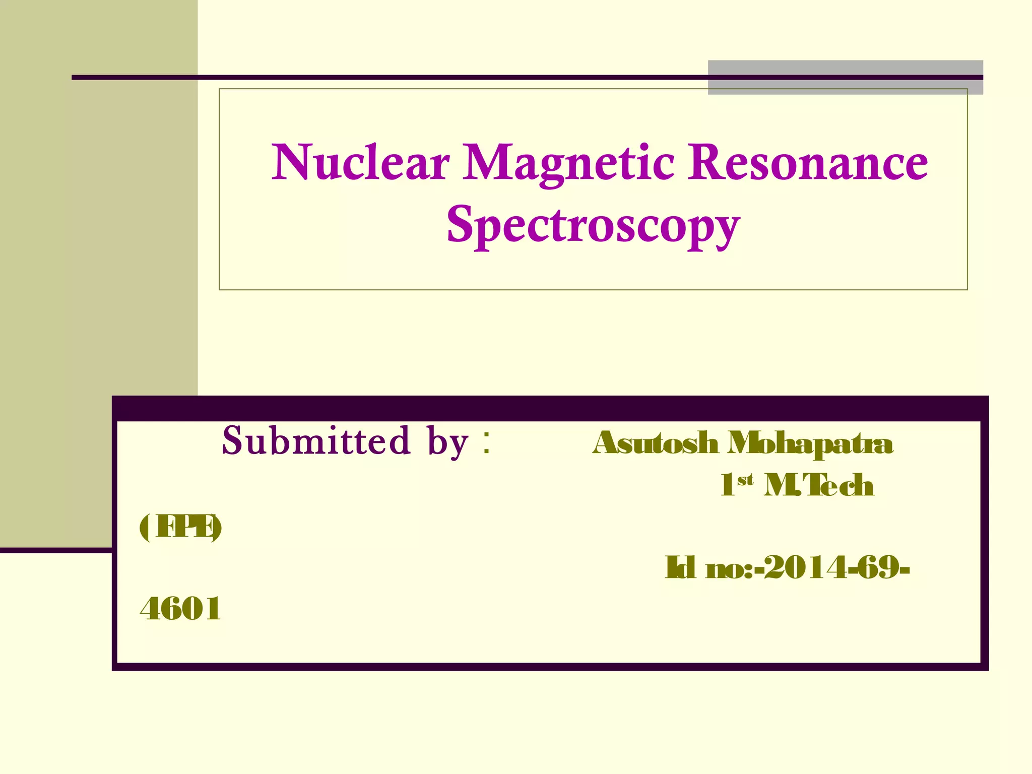Nuclear Magnetic Resonance Spectroscopy is a technique used to characterize organic molecules by identifying carbon-hydrogen frameworks. It exploits the magnetic properties of atomic nuclei when subjected to radio waves and magnetic fields. There are two main types of NMR spectroscopy: 1H NMR determines the number and type of hydrogen atoms, and 13C NMR determines the type of carbon atoms. When nuclei are placed in a magnetic field, their spins can be aligned with or against the field, producing detectable signals. Chemical shifts in these signals provide information about the molecular structure and atomic environment of the nuclei.