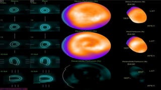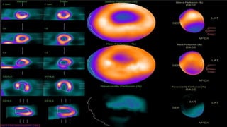 The document presents an overview of nuclear cardiology, emphasizing its role in assessing coronary heart disease and future heart attack risks through procedures like MUGA and MPI. It details case studies, patient preparation, testing protocols, and the efficacy of angioplasty and stenting in restoring blood flow to ischemic myocardium. The conclusion highlights the positive outcomes of intervention treatments in improving heart function.